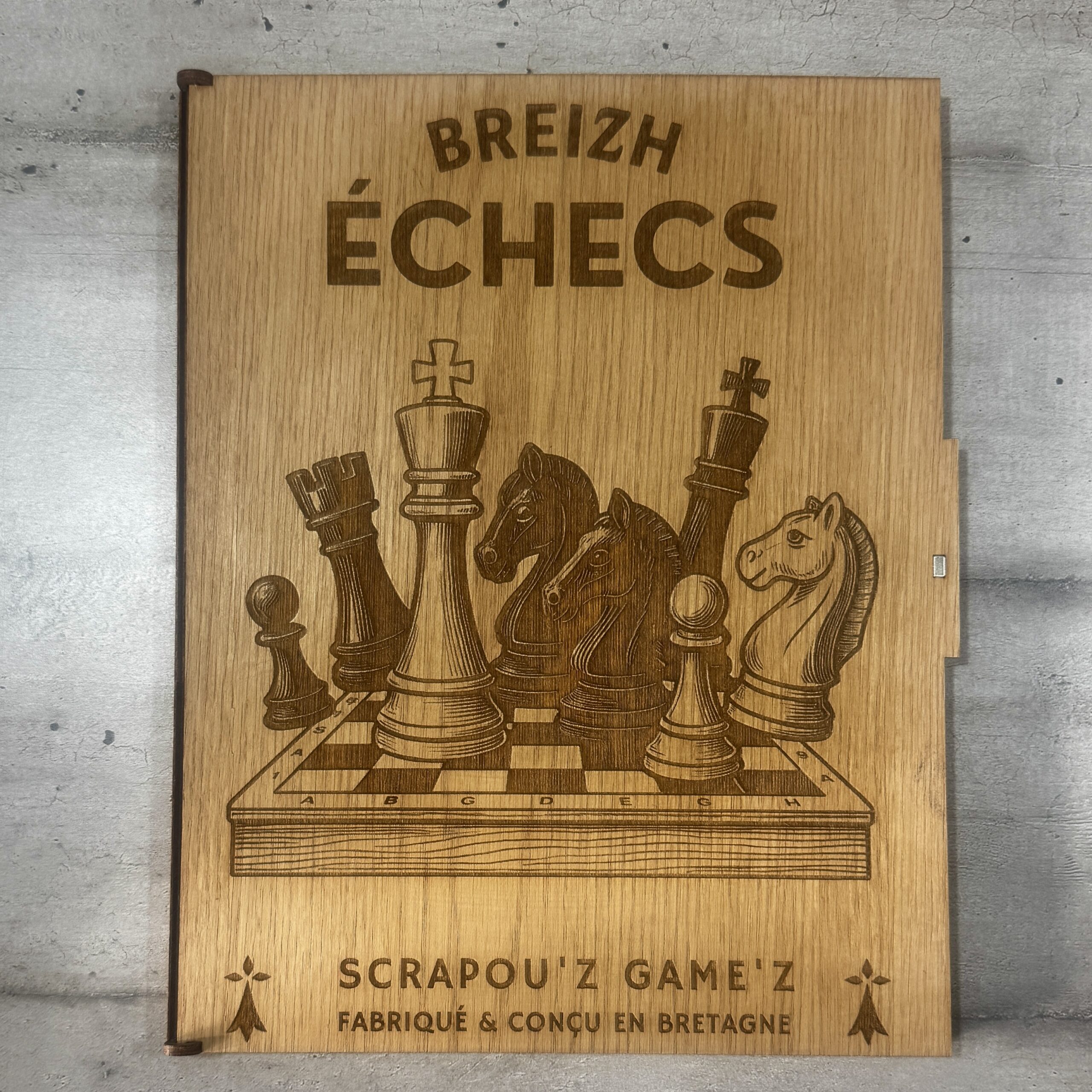 Le Breizh Échecs est un jeu d’échecs en bois conçu par Les Scrapou’z en format voyage, gravé et découpé au laser, puis assemblé à la main dans notre atelier breton.Vendu avec ou personnalisation en ajoutant par exemple un prénom ou un nom en gravure. Son format plat et proche d’une feuille A4 permet de le transporter facilement dans une sacoche d’ordinateur par exemple.