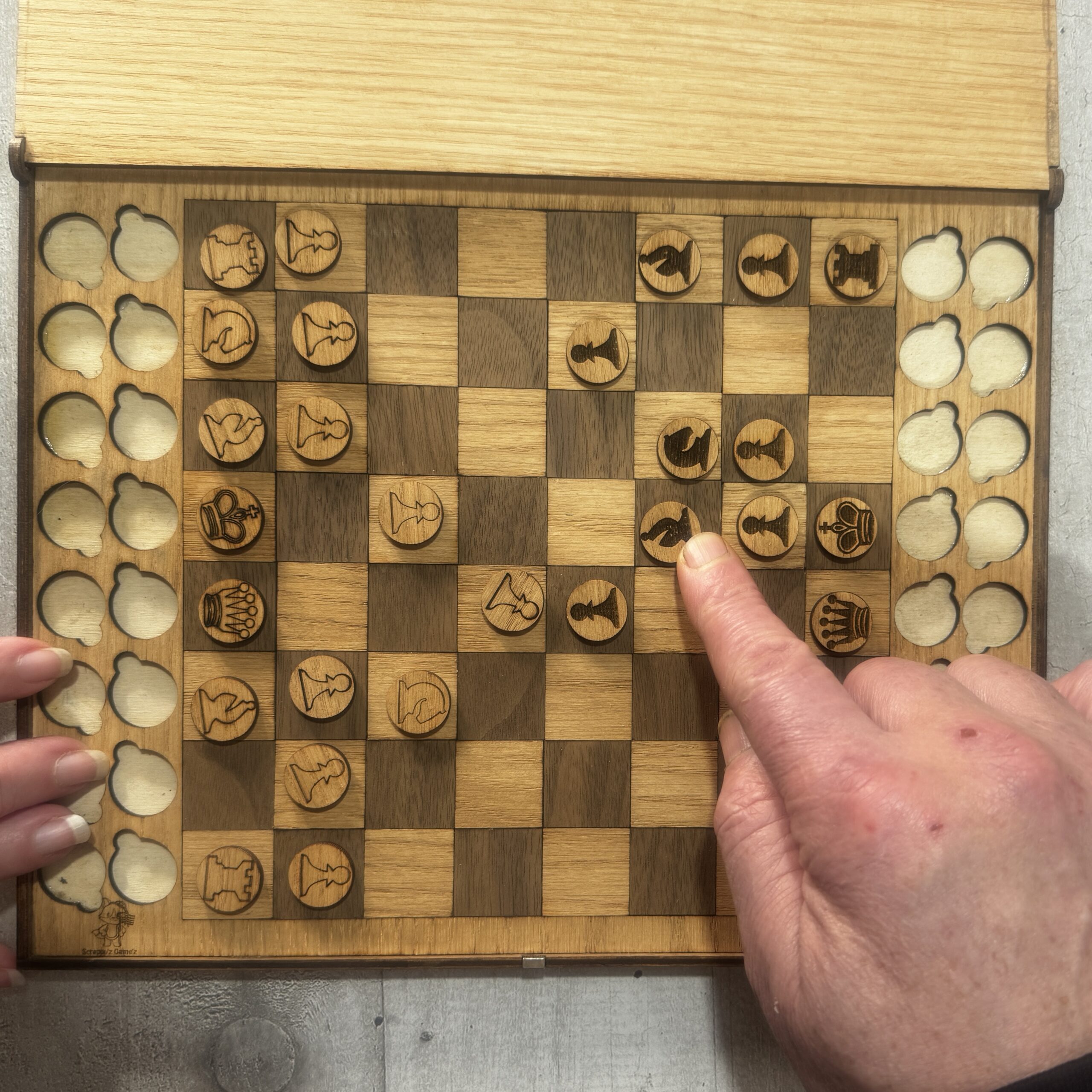 Le Breizh Échecs est un jeu d’échecs en bois conçu par Les Scrapou’z en format voyage, gravé et découpé au laser, puis assemblé à la main dans notre atelier breton. Son format plat et de la taille proche d’une feuille A4 le rend facilement transportable dans une sacoche d’ordinateur par exemple.
