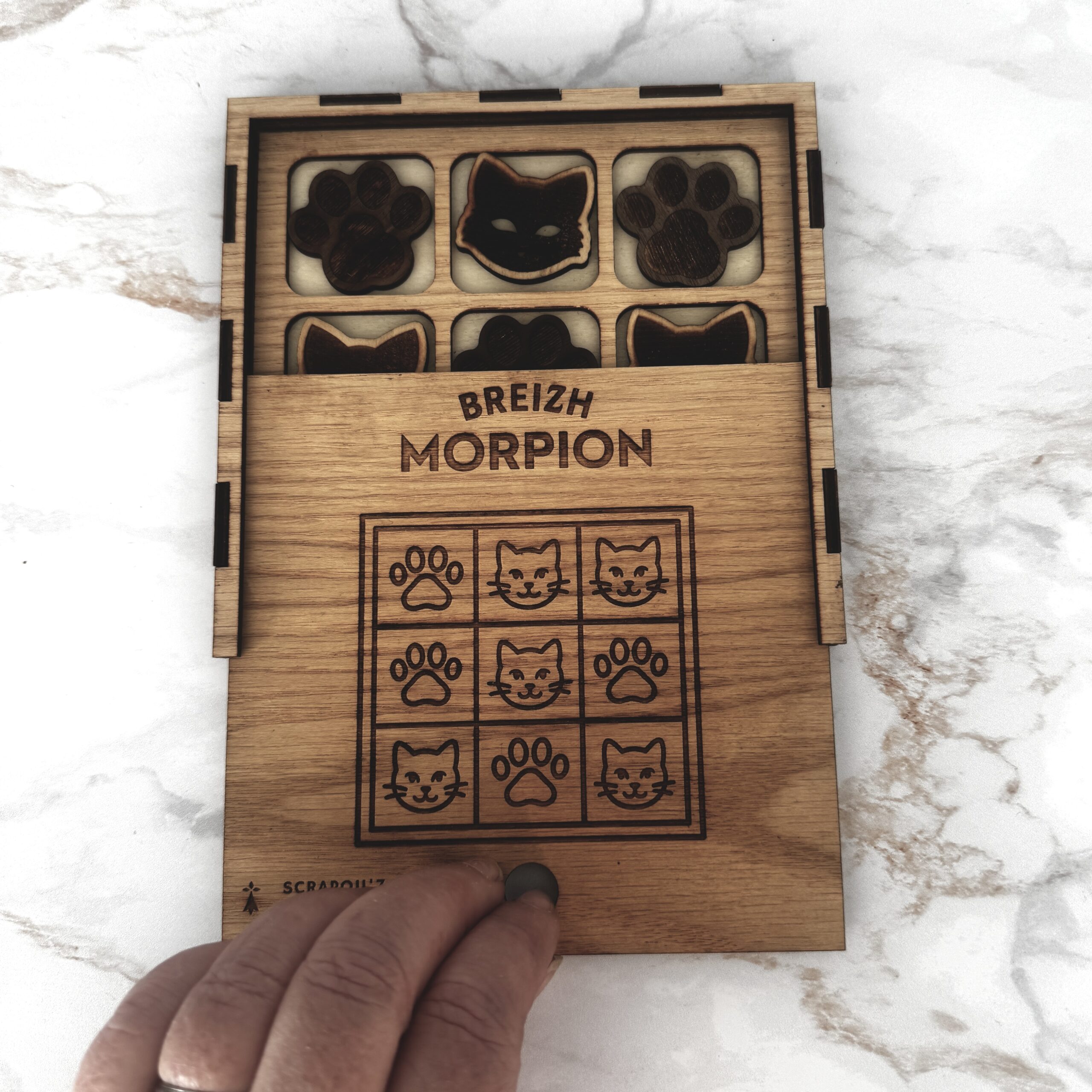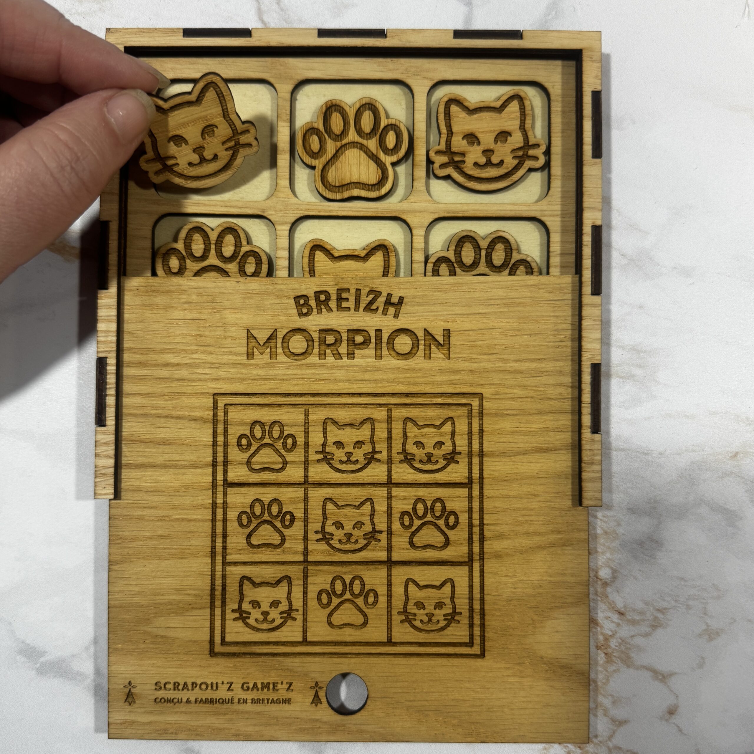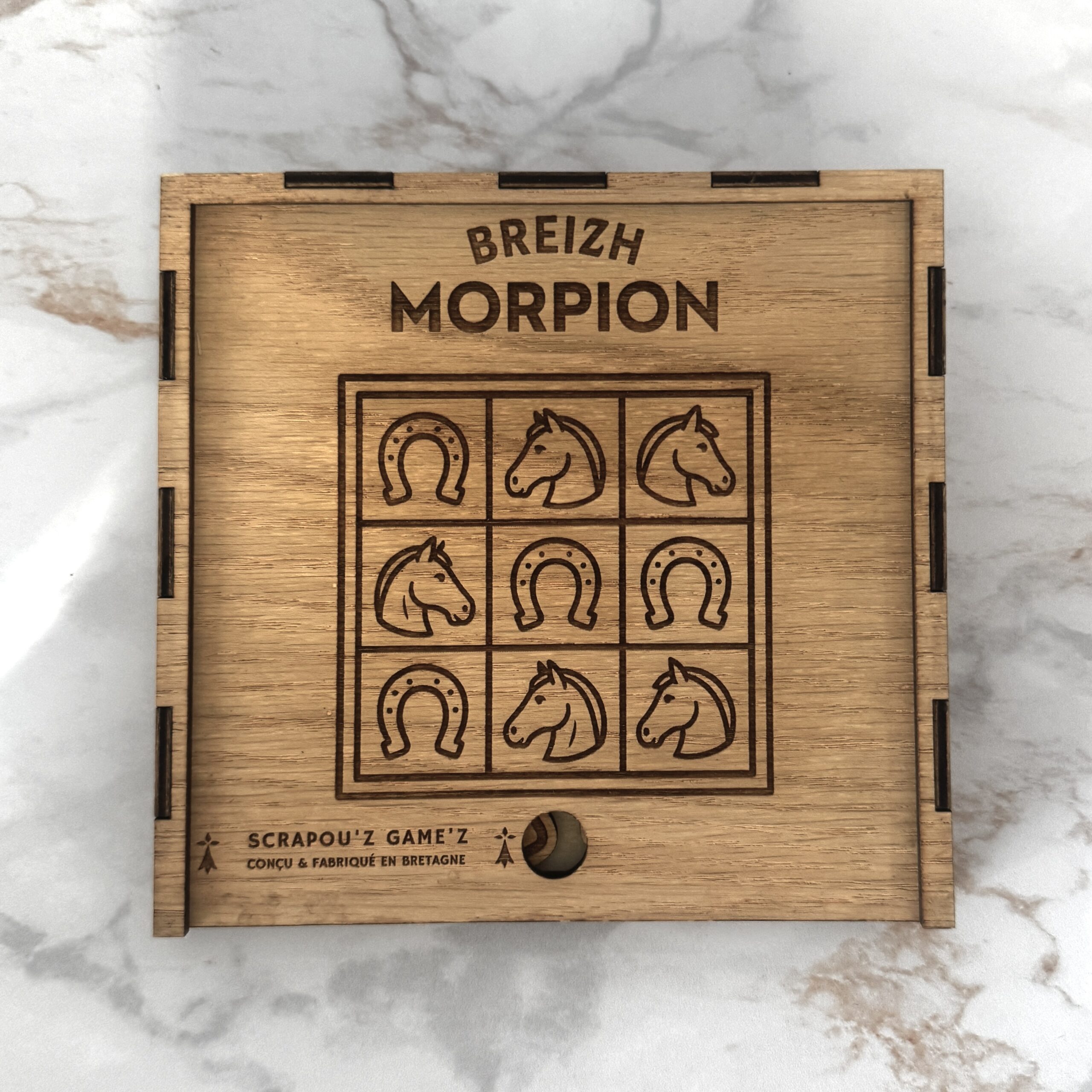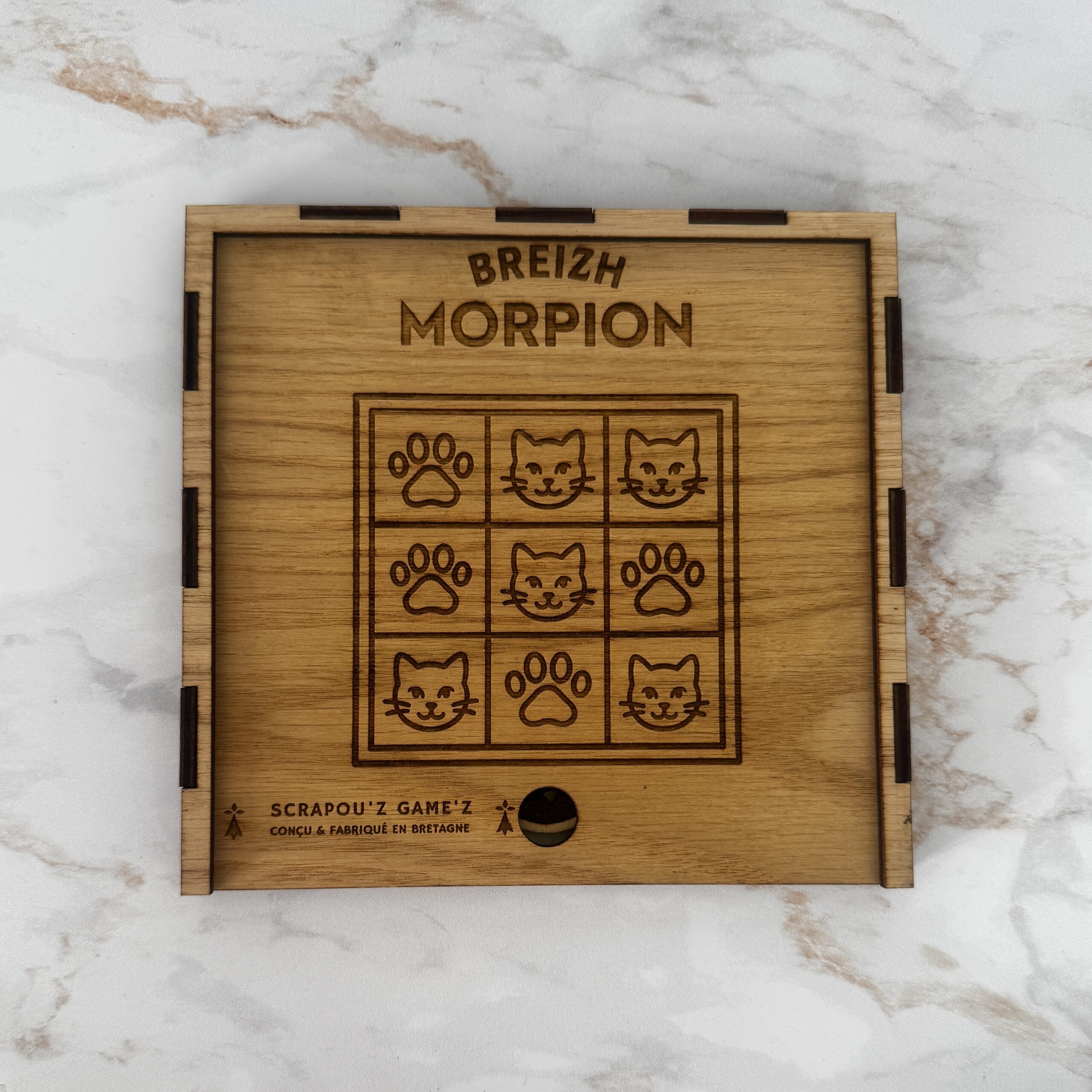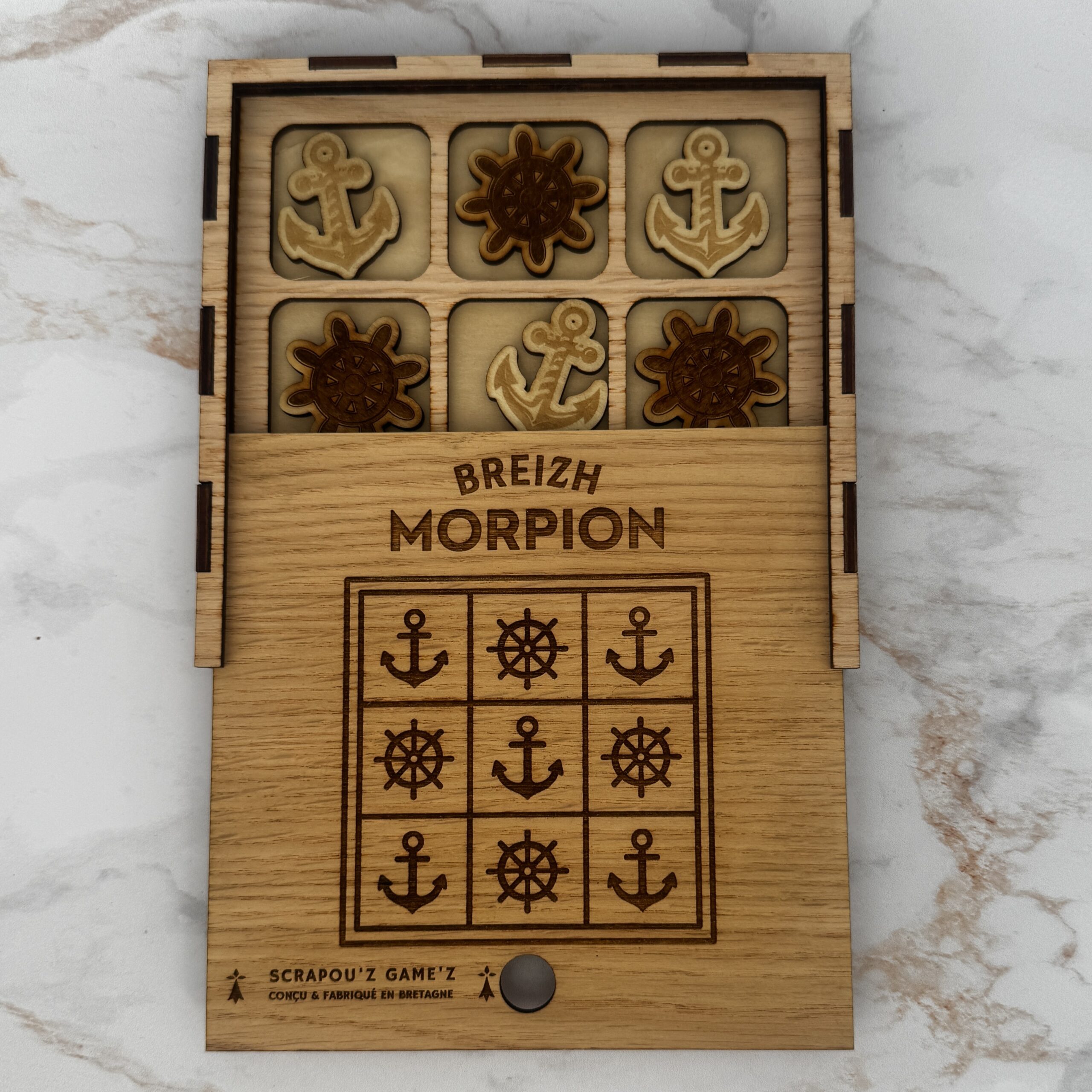 Le Breizh Morpion est un jeu de morpion en bois conçu par Les Scrapou’z en format voyage, gravé et découpé au laser, puis assemblé à la main dans notre atelier breton.